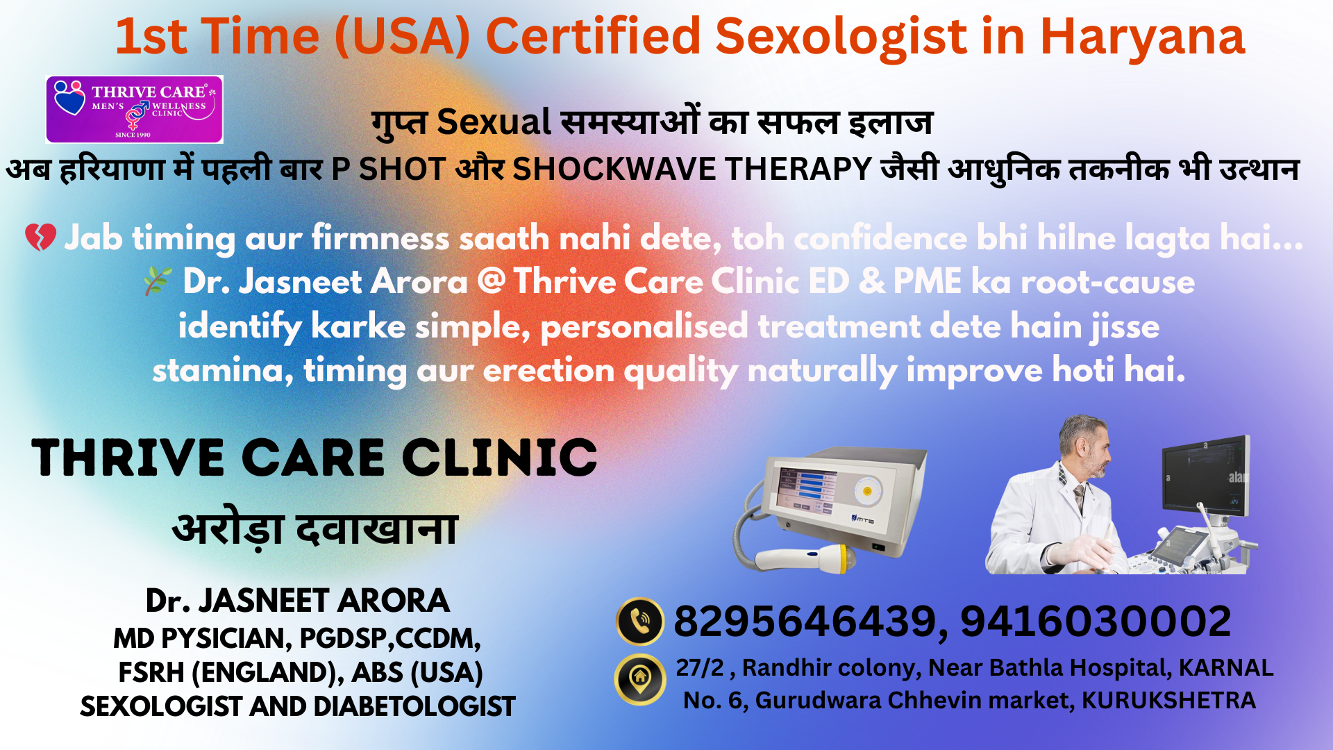 ED, PME aur low sexual desire sirf bedroom problem nahi hote — yeh person ke confidence, relationship aur mental health ko deeply affect karte hain. Jab partner ke saath intimate relation maintain nahi ho pata, to guilt, anxiety aur severe mental stress develop ho sakta hai. Isi stage par expert help zaroori hoti hai. Dr. Jasneet Arora at Thrive Care Clinic scientific evaluation, hormone testing, counseling aur modern treatments ke through root cause treat karte hain, jisse sexual performance, desire aur relationship confidence gradually improve hota hai. #ErectileDysfunction #PME #LowLibido #SexualHealth #MensHealth #CoupleProblems #RelationshipHealth #Sexologist #DrJasneetArora #ThriveCareClinic #thrivecare #drjasneetarora #sexologistinkarnal #sexologistinkaithal #sexologistinkurukshetra #sexologistinpanipat #sexologist #stdtreatment #sexologistnearme #erectiledysfunctiontreatment #prematureejaculationtreatment #bestsexologist #sexualhealthclinic #guptrogdoctor #thrivecareclinic #thrivecareclinickarnal #bestsexologistinindia #sexualhealthclinic #sexologistnearmen #erectiledysfunctiontherapy #prematureejaculation #bestsexologistinkarnal #bestsexologistinkaithal #bestsexologistinkurukshetra #bestsexologistinpanipat #bestsexologistinambala #sexologistinchandigarh #aroradawakhana #Pshot #shockwave